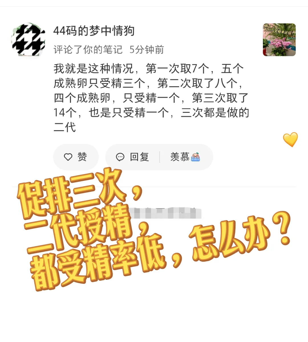 #试管婴儿那些事 #受精率低 一位小红薯在我的笔记下面的评论,已经促排三次,三次都是二代授精,三次的受精率都很低,怎么办?已经多次受